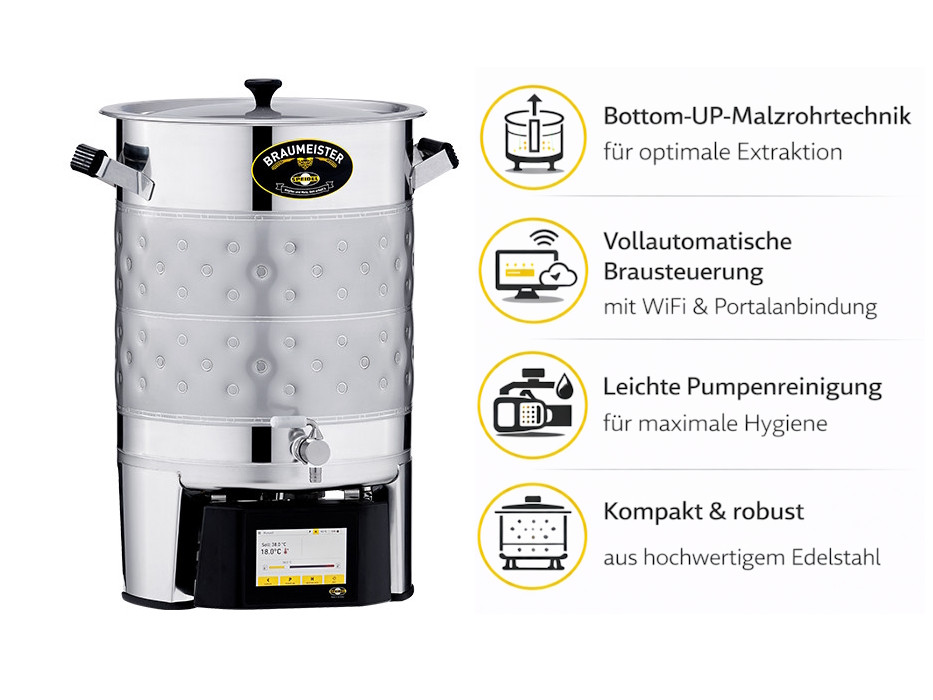 Die neue Brausteuerung braut mit Ihren individuellen Rezepten und führt Sie durch den Brauprozess. Mit dem in die Steuerung integrierten Wifi-Modul können Rezepte automatisch synchronisiert, oder Updates geladen werden. In allen Brauphasen wird die Zeit und Temperatur exakt gehalten (Messung in der Zugstange mitten im Malz). Der werkseitig angeschweißte Doppelmantel macht bisherige Zubehörteile überflüssig und gibt Ihnen noch mehr Freiheit beim Bierbrauen.Im Gegensatz zu den umständlichen Gerätschaften mancher anderer Hobbybrauer muss beim Braumeister auch nicht die ganze Zeit gerührt werden. Durch die patentierte Malzrohr-Technik wird die Bierwürze schonend und bequem umgewälzt. So brennt nichts an und es muss während den Brauphasen auch nicht umgefüllt werden. Zum Ablassen des Schmutzwassers befindet sich am Kesselboden ein zusätzlicher Ablauf mit Hahn, was das Reinigen erheblich erleichtert.