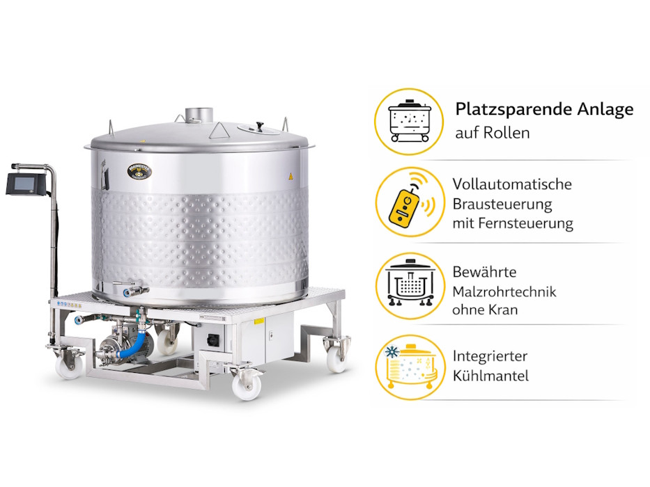 The other advantages of the Braumeister concept and the technical data for heating, pump and control remain the same. These include the small space requirement, maximum flexibility as it is on castors, without a crane and made of the highest quality stainless steel.